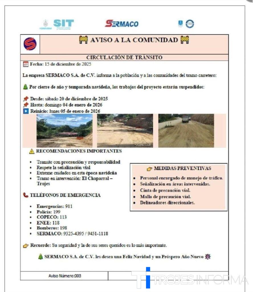 La empresa SERMACO S.A. de C.V. informa a la población y a las comunidades del tramo carretero El Chaparral – Trojes que, por motivo de cierre de año y temporada navideña, los trabajos del proyecto estarán temporalmente suspendidos.