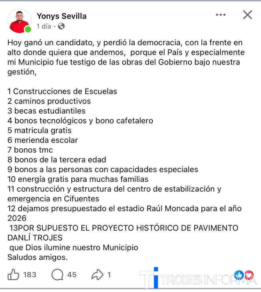 Yonys Sevilla manifestó que, aunque en la contienda “ganó un candidato”, a su criterio “perdió la democracia”, señalando que el país y particularmente el municipio de Trojes fueron testigos de diversas obras ejecutadas durante la gestión de su partido. En su mensaje enumeró proyectos y programas desarrollados, entre ellos la construcción de escuelas, caminos productivos, becas estudiantiles, bonos sociales, matrícula y merienda escolar, apoyo a la tercera edad, energía gratuita para familias, así como obras de infraestructura y proyectos presupuestados para el año 2026, incluyendo el estadio Raúl Moncada y el proyecto de pavimentación Danlí–Trojes.