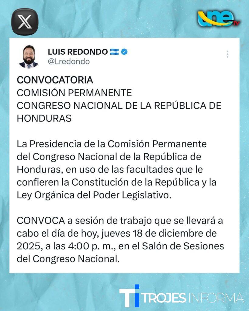 El presidente del Congreso Nacional de la República de Honduras y de la Comisión Permanente, Luis Rolando Redondo Guifarro, convocó oficialmente a los miembros de la Comisión Permanente a una sesión de trabajo a realizarse este jueves 18 de diciembre de 2025, a las 4:00 de la tarde, en el Salón de Sesiones del Congreso Nacional, en Tegucigalpa.