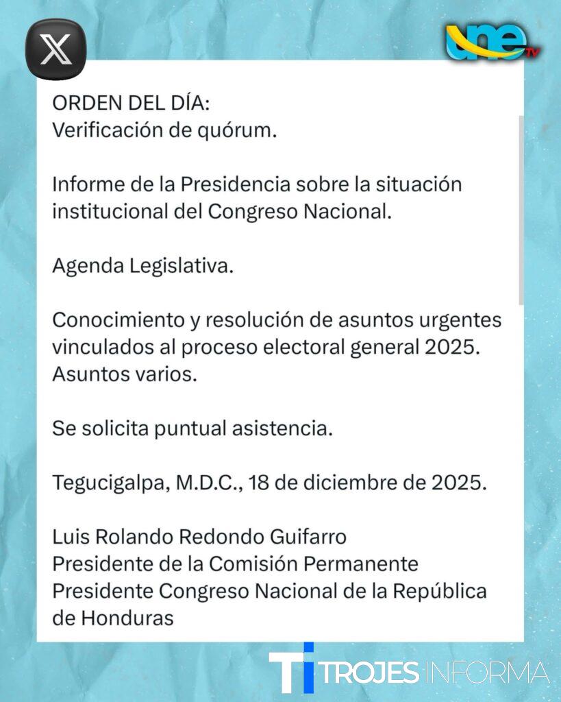 El presidente del Congreso Nacional de la República de Honduras y de la Comisión Permanente, Luis Rolando Redondo Guifarro, convocó oficialmente a los miembros de la Comisión Permanente a una sesión de trabajo a realizarse este jueves 18 de diciembre de 2025, a las 4:00 de la tarde, en el Salón de Sesiones del Congreso Nacional, en Tegucigalpa.