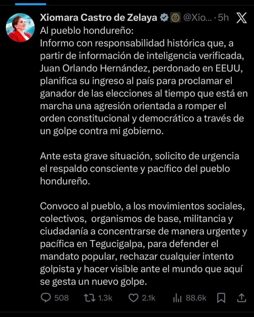 Asimismo, reiteró que no tiene intención de regresar a Honduras en este momento, argumentando falta de garantías, riesgos a su seguridad y la de su familia, y una presunta persecución e instrumentalización de la justicia. Dijo contar con información sobre posibles atentados en su contra y responsabilizó directamente a líderes del gobierno y a la cúpula de LIBRE por cualquier riesgo que pudiera enfrentar su familia o él.