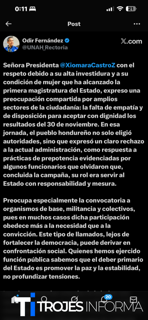 El rector de la Universidad Nacional Autónoma de Honduras (UNAH), Odir Fernández, emitió un pronunciamiento público en el que expresó su preocupación por el clima político que vive el país tras las elecciones del pasado 30 de noviembre, haciendo un llamado a la serenidad, al respeto de los resultados electorales y a la preservación de la institucionalidad democrática.